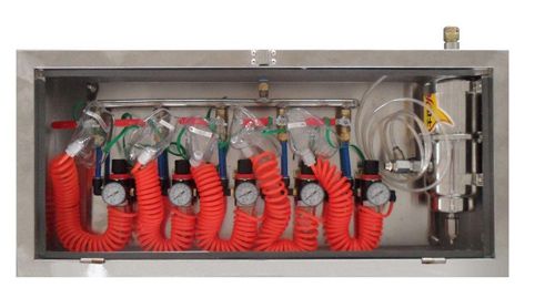 壓風自救器一般形成系統(tǒng)后使用,即由若干組壓風自救裝置安裝在同一個地點形成壓風自救站,每組一般由3~5個頭組成,每個地點裝多少個頭,應視該工作場所的工作人數(shù)而定,其安裝頭數(shù)應大于在該場所工作的人數(shù)。該裝置系統(tǒng)結(jié)構(gòu)簡單,價格便宜,是一種經(jīng)濟型性自救裝置系統(tǒng)。